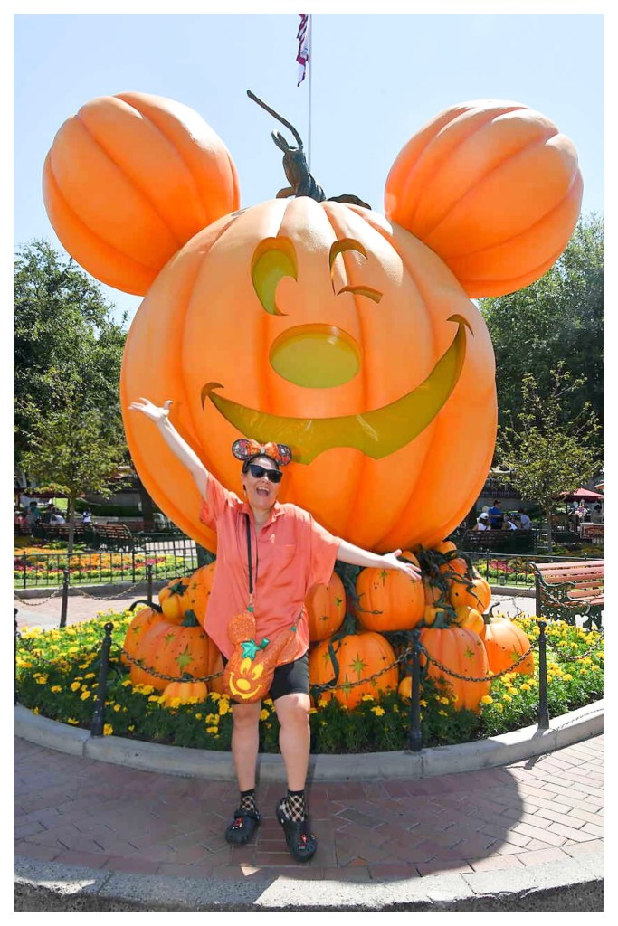 The first day of Halloween Time at the Disneyland Resorts is a big deal. Like take the day off work, plan an outfit, big deal. It’s the first official day that all of the Halloween offerings begins. The seasonal merchandise, the themed food, the outrageous desserts, and the Halloween photo opportunities. I took my first Mickey pumpkin picture of the season, despite the record temperatures that day I tried to wear a festive outfit. What is not pictured is the fan I wore around my neck all day long!